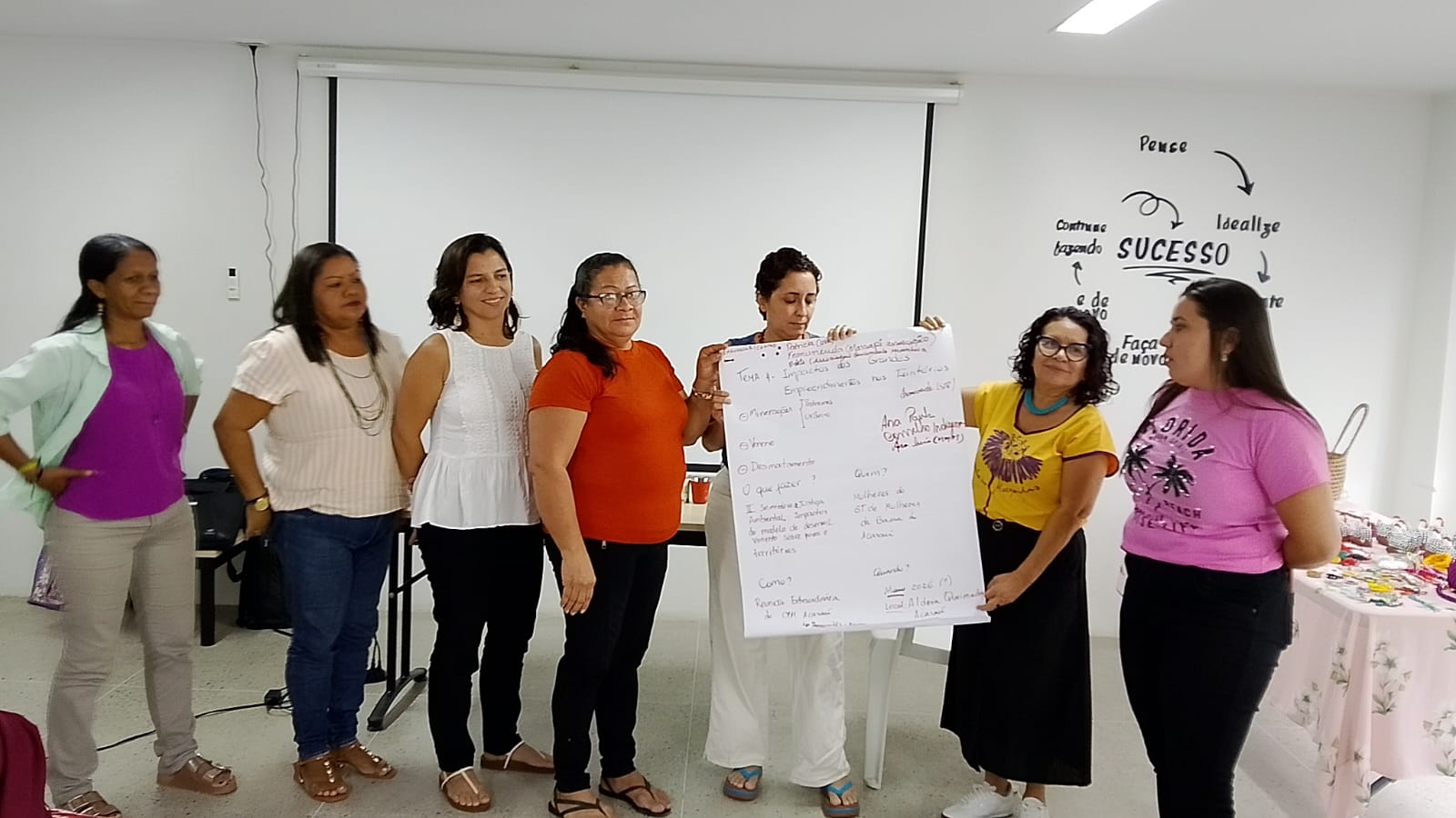 Durante o encontro, as participantes foram divididas em grupos temáticos para debater propostas e construir encaminhamentos em quatro eixos centrais: impactos dos grandes empreendimentos nos territórios; saneamento básico; alimentação saudável e segurança alimentar (com foco em quintais produtivos e medicina tradicional); e economia solidária.