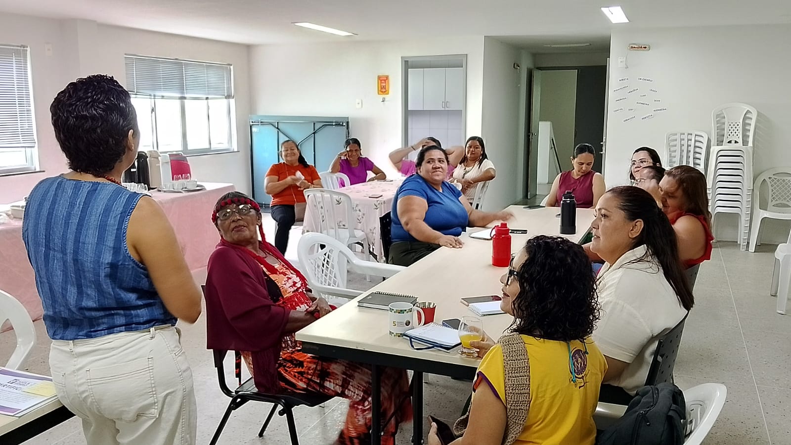 Durante a discussão, foram ressaltados pontos como a sobrecarga das mulheres em contextos de crise, uma vez que socialmente são responsáveis pelo cuidado com a água, a alimentação e as pessoas da família, responsabilidades que se intensificam em situações climáticas extremas, gerando a chamada “pobreza de tempo”.
